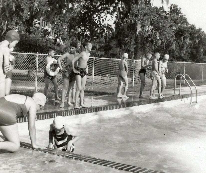 with bathing caps. Boys include: third from right is Wayne Shull. At pool edge with